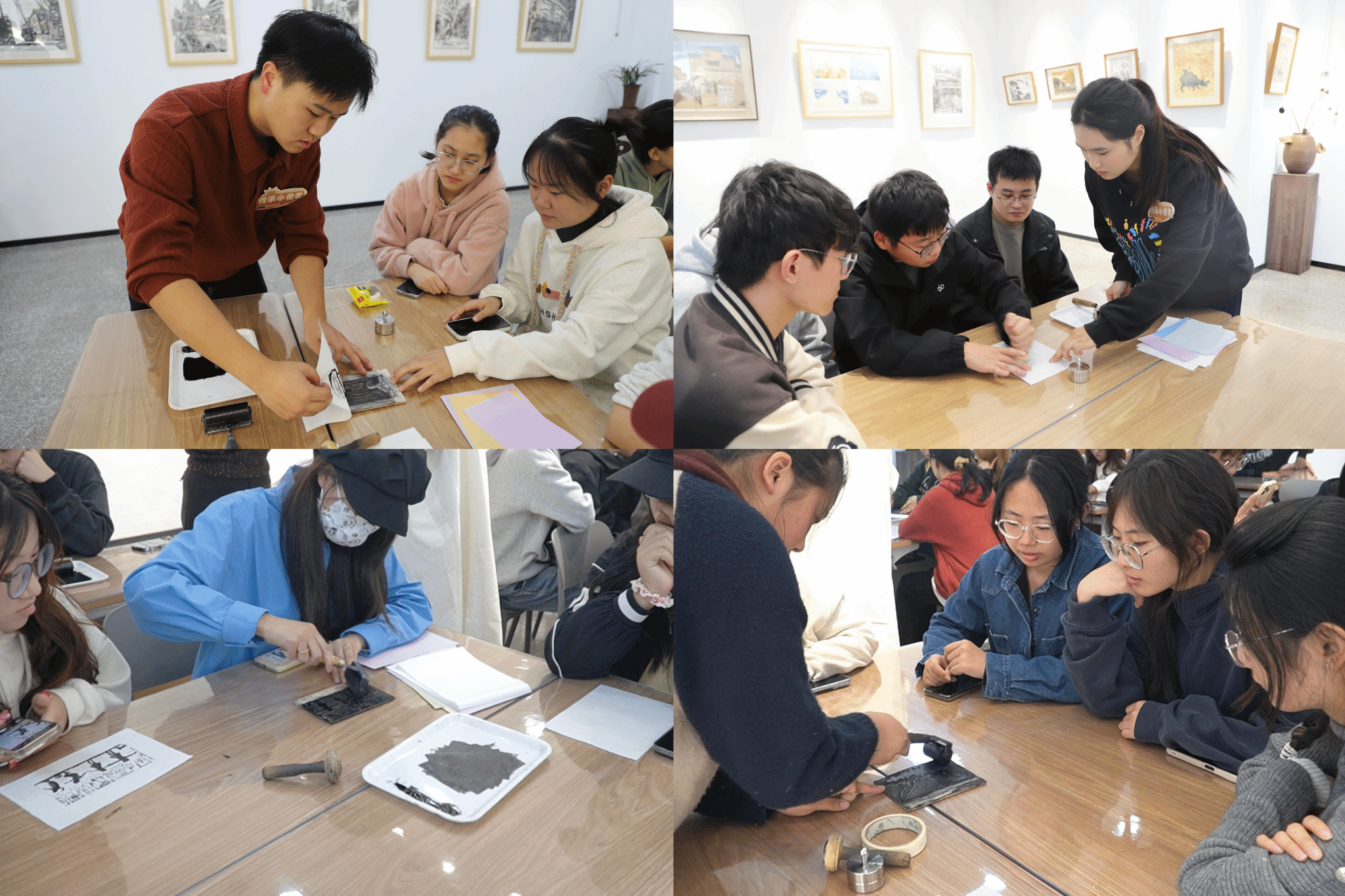 如果说“初识”是艺术理论的浸润,那么紧随其后的“徽派版画实践体验活动”则是情感的升华与技艺的触碰。在本场活动美育导师、传承基地负责人郭益老师的指导下,同学们亲手调墨、拓印,亲历从画稿到成品的完整工艺。尽管手法稚嫩,但每一次的专注、每一张的印痕,都让同学们深刻体会到非遗技艺背后所蕴含的严谨与创造精神。活动过程中,美术与设计学院的志愿者同学们作为“传承小使者”与参与体验的同学们一起动手制作。当一幅幅带有个人印记的版画作品最终呈现时,现场洋溢的不仅是成功创作作品的喜悦,更是与悠久传统文化产生深度链接的热爱。